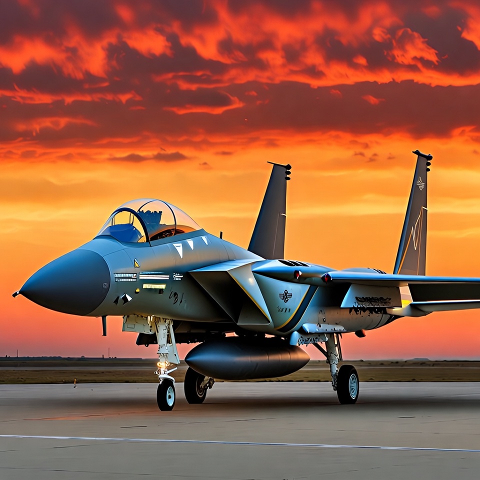 A gray F-15 fighter jet with vertical stabilizers and underbelly fuel tank sits on a runway. The aircraft features US Air Force markings and is positioned against a vibrant orange and red sunset sky with scattered clouds. Landing gear is down, and the scene shows a clear tarmac extending into the distance.