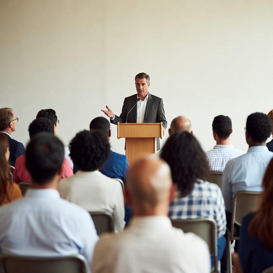 A middle-aged man in a gray suit stands at a wooden podium, gesturing with his hand while speaking into a microphone. A diverse audience of men and women sits in chairs facing him in a spacious room with beige walls. The attendees wear business casual attire and appear attentive.