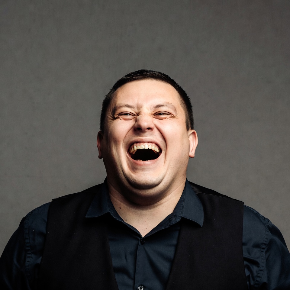 adult man, black vest, blue shirt, closeup, dark hair, formal attire, gray background, happy, headshot, joyful expression, laughing, male, open mouth, portrait, short hair, smile, squinted eyes, teeth showing, wide smile, man