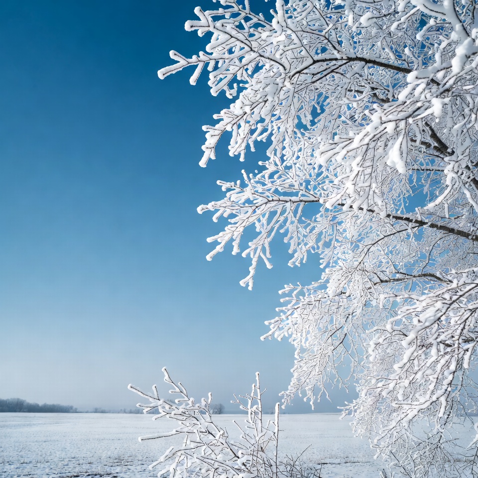 blue sky, branches, clear sky, cold weather, frost, frozen tree, ice crystals, nature, snow, snow-covered branches, snowy field, twigs, white frost, winter landscape, winter tree, frosty tree