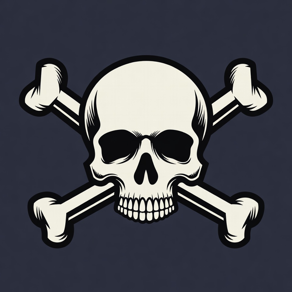 A bold black and white skull and crossbones illustration features a grinning white skull centered over two white crossed bones. The design has thick black outlines and shading for a striking vector art effect. It is set against a solid dark blue background.