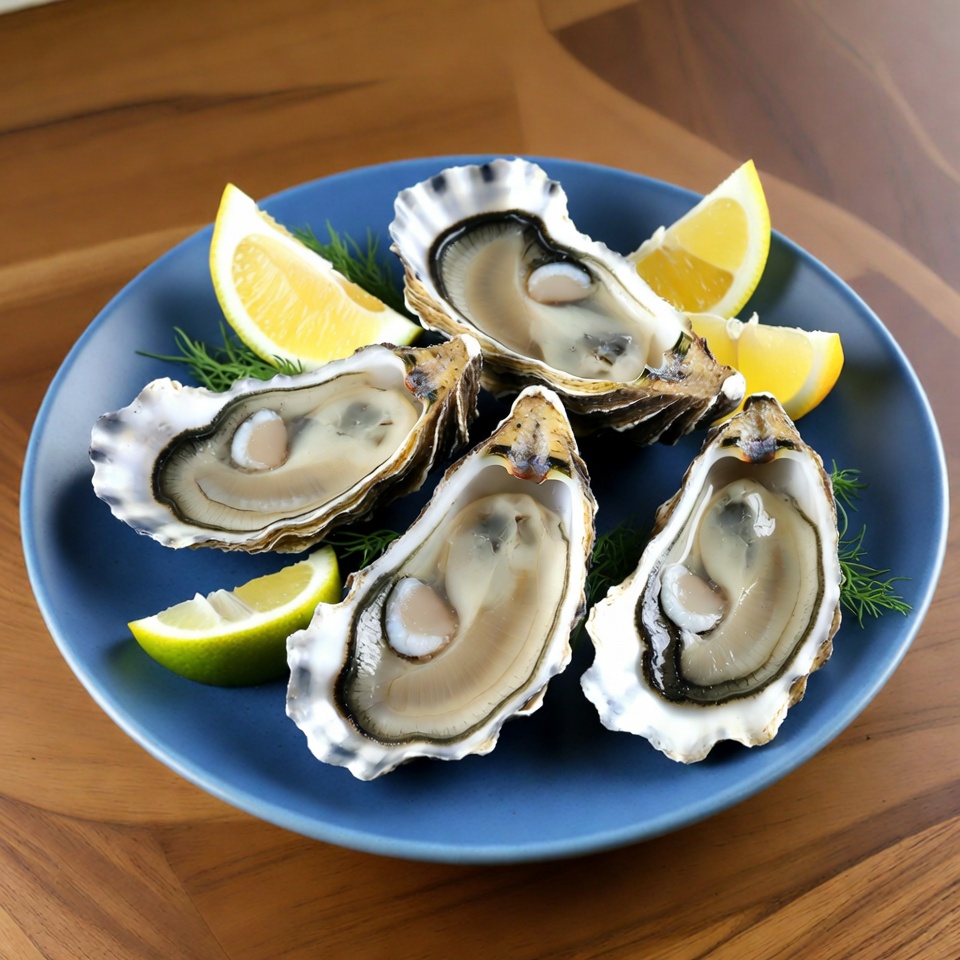 Several fresh oysters on the half shell are arranged on a blue plate. They are garnished with lemon wedges and dill sprigs. The plate rests on a wooden table.