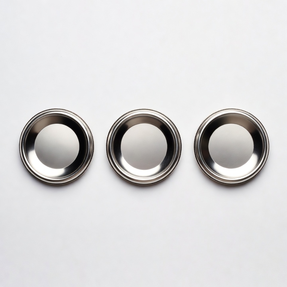 canning lids, isolated, kitchen lids, mason jar lids, metal lids, metallic rims, preservation lids, product photography, reflective surface, round lids, shiny metal, silver lids, three lids, white background, jar lids