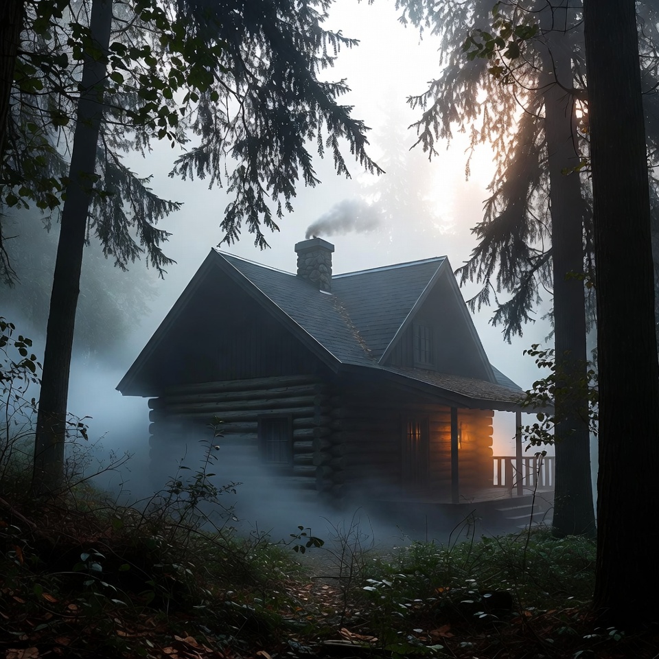 A small log cabin with a smoking chimney sits nestled among dense fir trees in a misty forest. Warm light glows from the windows and porch, contrasting the surrounding fog and dark woods. Fallen leaves and underbrush cover the ground around the cabin.