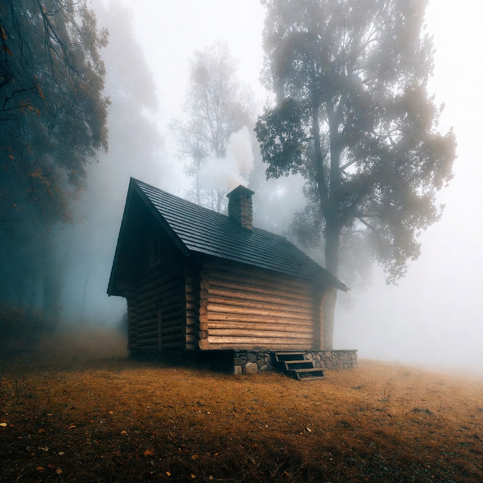 autumn forest, autumn trees, cabin, chimney smoke, cozy cabin, dense woods, fall foliage, fog, foggy forest, foggy landscape, forest, isolated cabin, mist, misty, mountain cabin, nature, outdoors, remote cabin, rustic cabin, smoke, trees, wooden house, woodland, log cabin