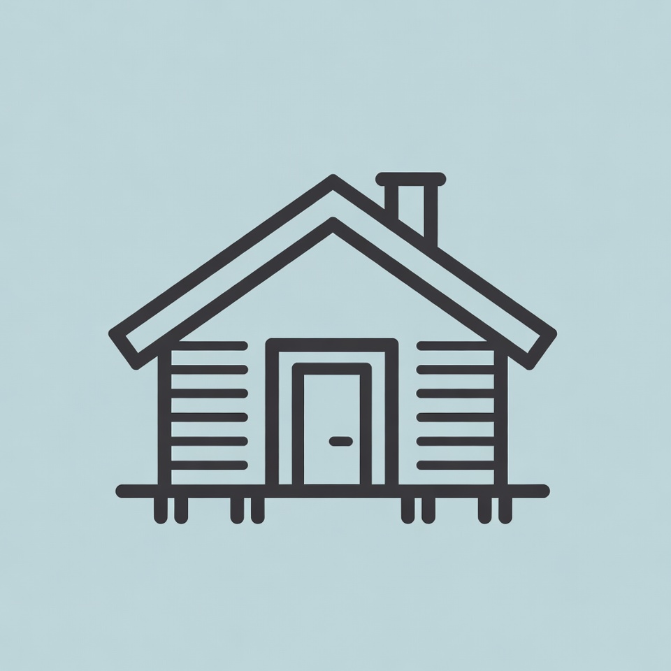 A simple black line drawing of a log cabin on a light blue background. The cabin features horizontal log walls, a sloped roof with a chimney, a central front door, and small foundation stilts. It has a minimalist, isolated clipart style.