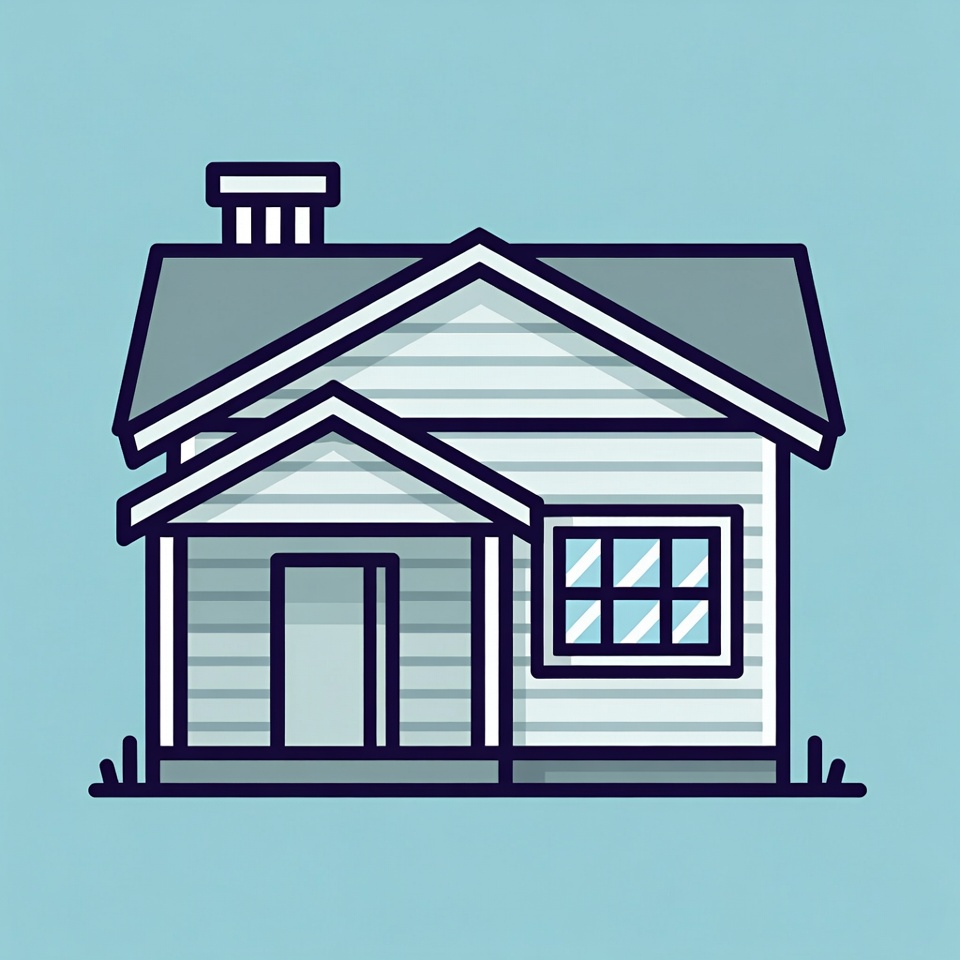 A simple line art illustration of a house features a sloped gray roof, white siding, and a front porch with a door and window. A chimney rises from the roof, and small grass tufts appear at the base. The house is centered on a solid light blue background.