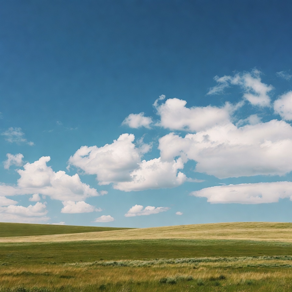 blue sky, clear sky, clouds, countryside, fields, golden grass, grass, green fields, hills, horizon, landscape, lush grass, meadow, nature, outdoors, panoramic view, prairie, rural, scenery, sky, summer, vast landscape, white clouds, rolling hills