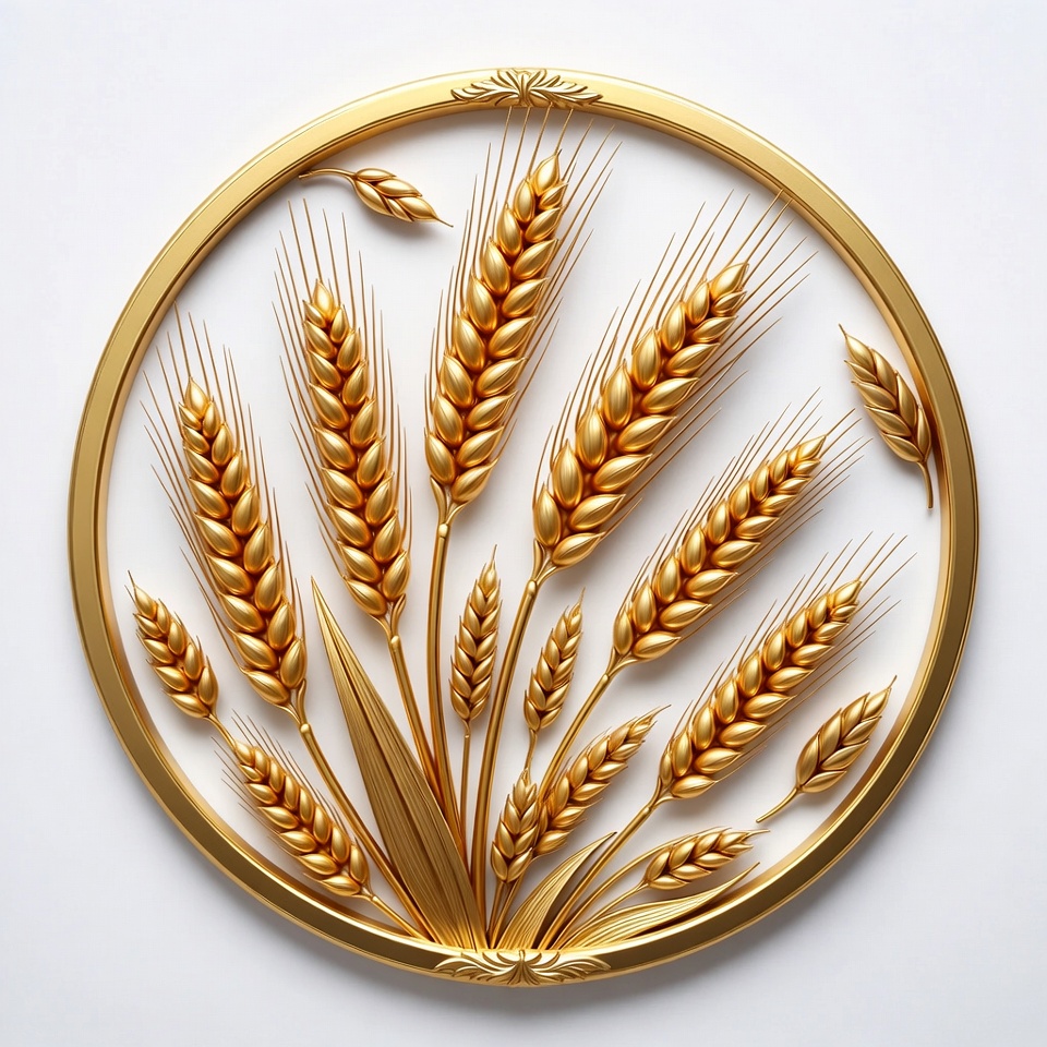 A cluster of golden wheat stalks and sheaves is arranged within an ornate golden circular frame. The wheat features detailed spikes and leaves, rendered in a realistic 3D style against a white background. Fine decorative flourishes adorn the edges of the frame.