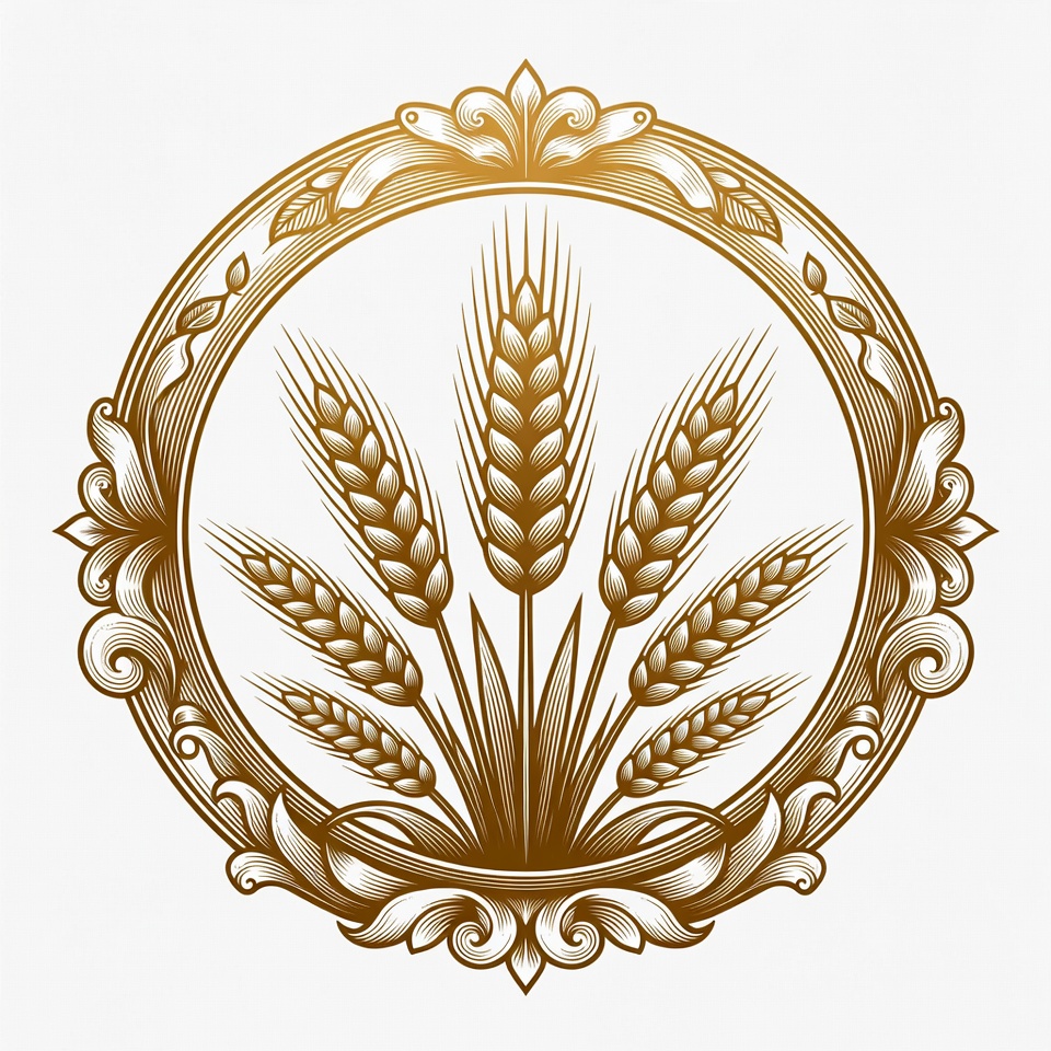 An illustration of golden wheat stalks arranged in a bouquet inside a circular ornate frame. The frame features intricate floral and decorative gold filigree designs on a white background. The wheat is detailed with fine lines emphasizing the grains and stems.