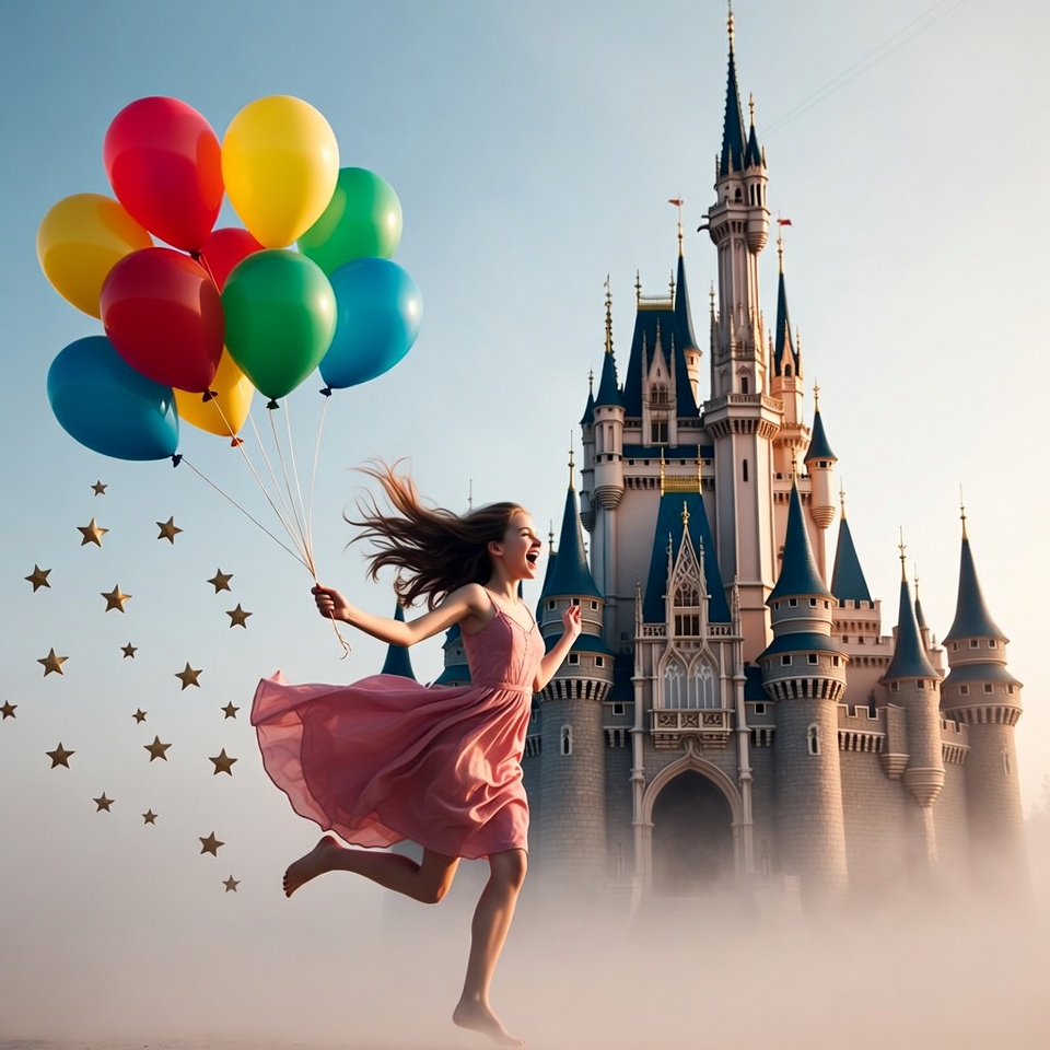 Cinderella Castle, Disney castle, White, balloons, barefoot, blue balloons, castle background, colorful balloons, female, flowing dress, golden stars, green balloons, joyful, long hair, misty background, pink dress, red balloons, running, yellow balloons, young girl, girl