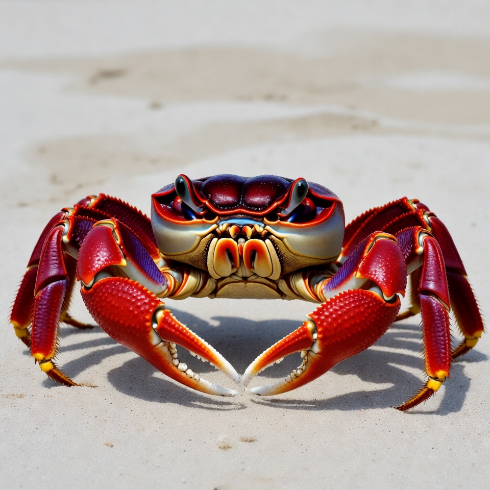 A vibrant red crab with multicolored claws stands prominently on a white sandy beach. Its glossy shell features red, purple, and yellow hues, with detailed eyes and raised pincers. The crab is positioned frontally against a blurred beach background.