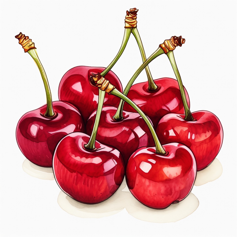 A cluster of six shiny red cherries with green stems is arranged together. The illustration features detailed watercolor-style rendering with highlights on the fruit surfaces. They sit on a plain white background.