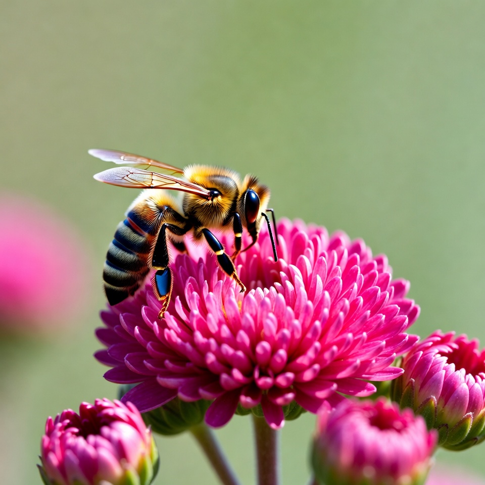 A honey bee with yellow and black stripes is perched on a vibrant pink flower, extending its proboscis to drink nectar. The bee's wings are slightly spread, and its legs grip the flower's petals. Surrounding the main flower are smaller pink buds on green stems against a blurred green background.