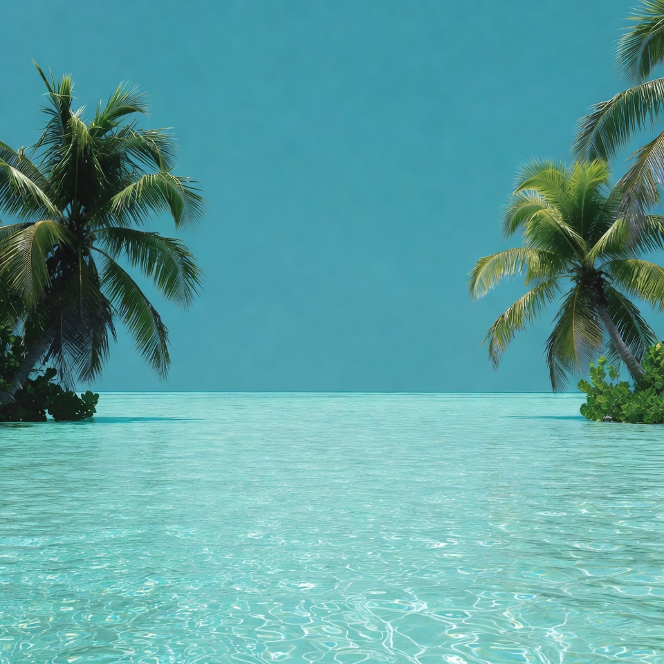 Two clusters of lush green palm trees frame a serene turquoise lagoon with clear shallow waters. The sky above is a vibrant blue, blending seamlessly with the ocean horizon. Gentle ripples reflect the tropical paradise scene.