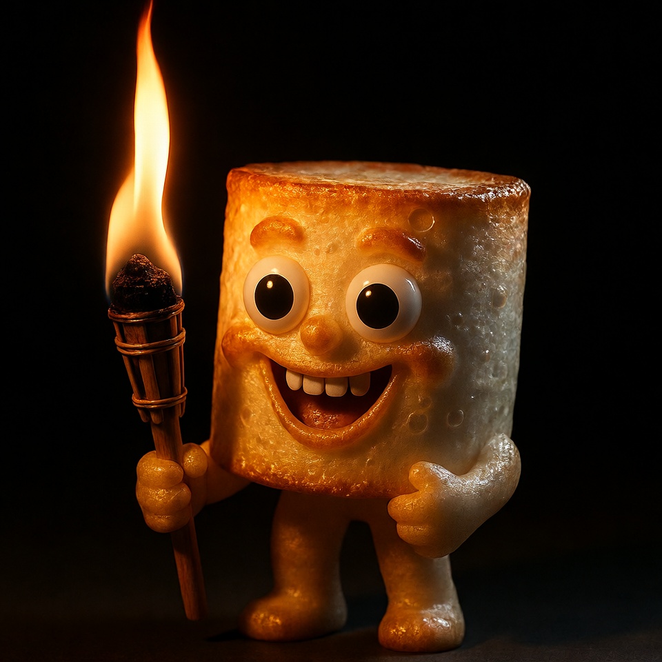 3D render, anthropomorphic, bamboo torch, big eyes, cartoon, character, clipart, cute, dark background, fire, flame, fun, golden brown, holding torch, illustration, isolated background, smiling, toasted, torch, marshmallow