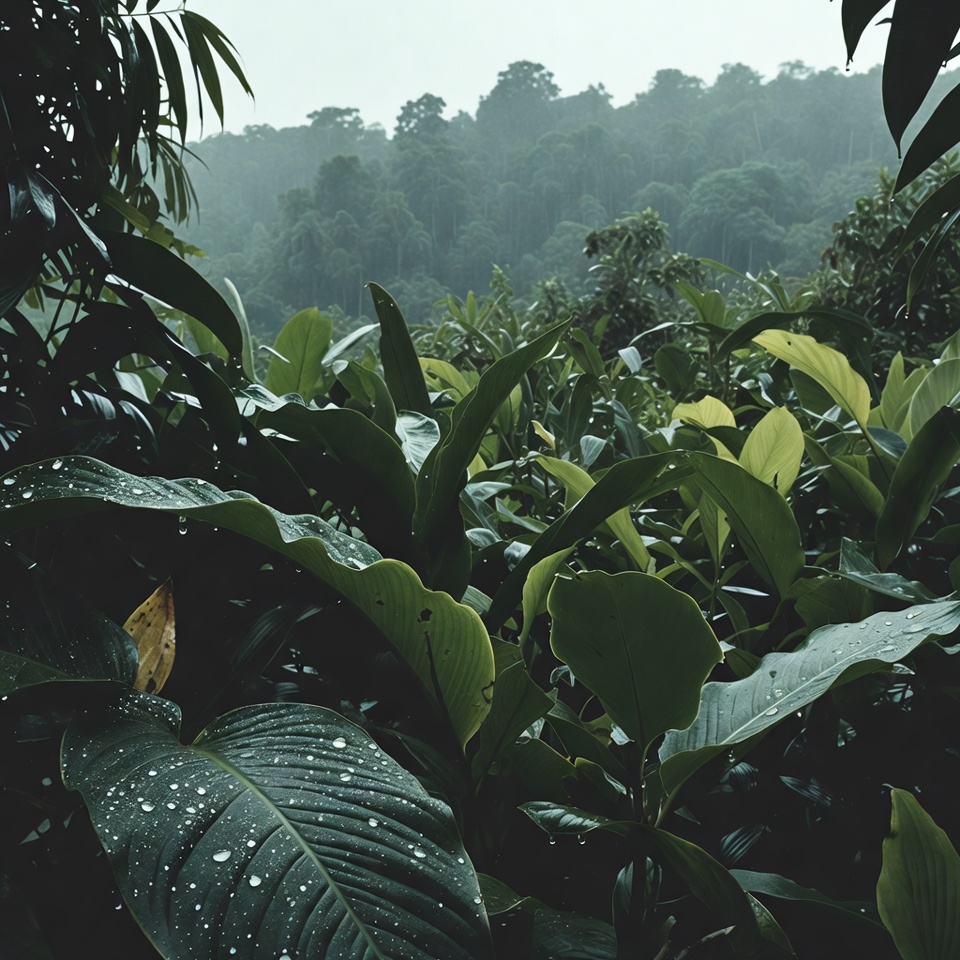 broad leaves, dense forest, exotic plants, foliage, forest, green leaves, greenery, humid, jungle plants, leaf closeup, lush vegetation, misty background, nature, plants, rain droplets, rainforest, tropical plants, water drops, wet leaves, wilderness, tropical jungle