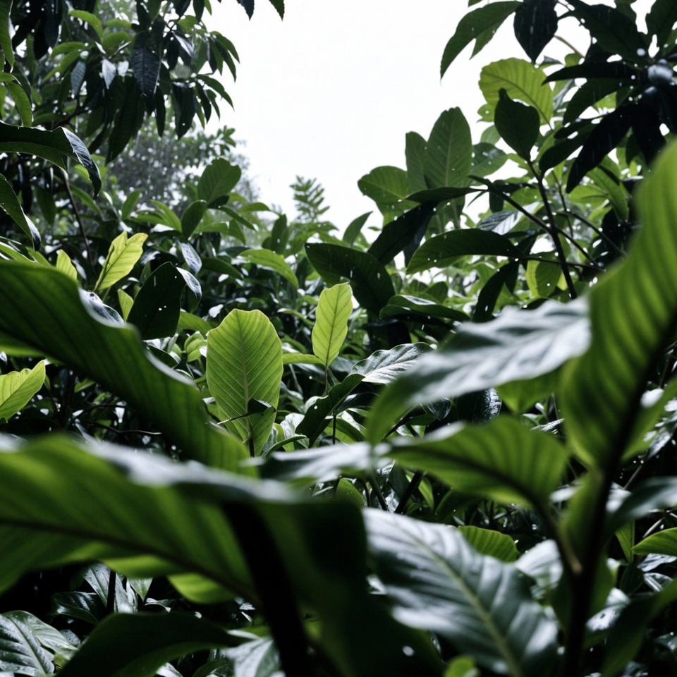 botany, bright sky, broad leaves, dense leaves, exotic plants, foliage background, fresh leaves, glossy leaves, green foliage, green leaves, jungle vegetation, leaf cluster, leaf texture, leaf veins, lush foliage, nature closeup, nature photography, plant macro, rainforest leaves, rainforest plants, tropical forest, tropical plants, vibrant green, water droplets, wet leaves, tropical leaves