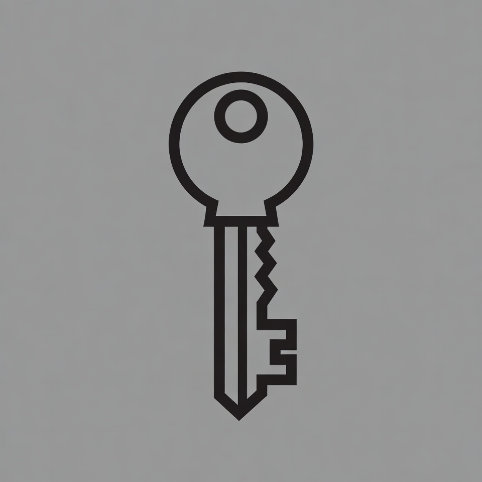 A simple black line drawing of a key with a round bow and jagged teeth on a light gray background. The key is depicted in a minimalist outline style, isolated for easy use in designs.