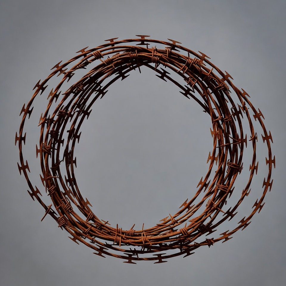 A close-up view of rusted barbed wire coiled into a perfect circle against a gray background. The sharp barbs protrude from the twisted metal wires, forming a continuous loop. The image highlights the texture and rust on the wire.
