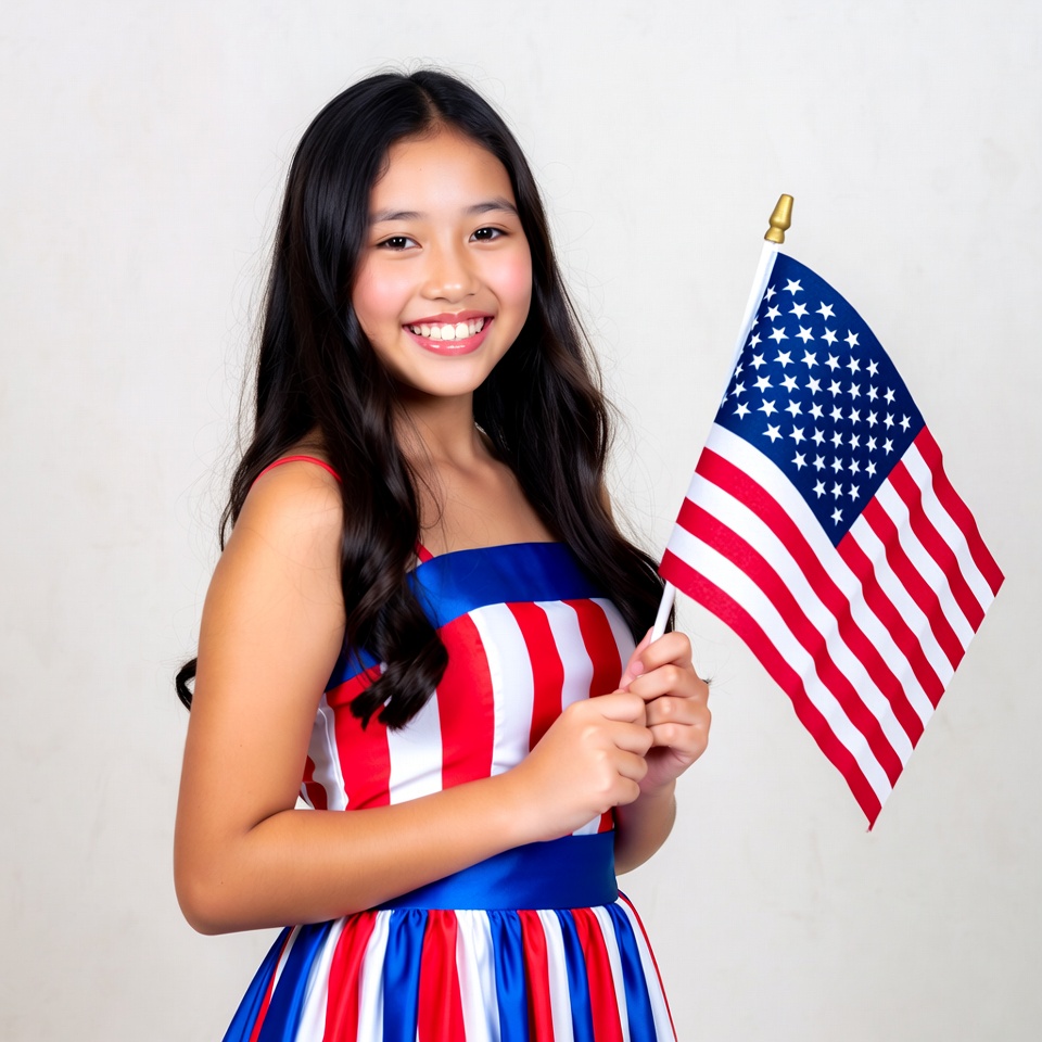 American flag, Asian, USA flag, blue dress, dark hair, female, flag holder, happy girl, isolated background, long hair, patriotic, portrait, red dress, smiling, striped dress, waving flag, white dress, young girl, girl