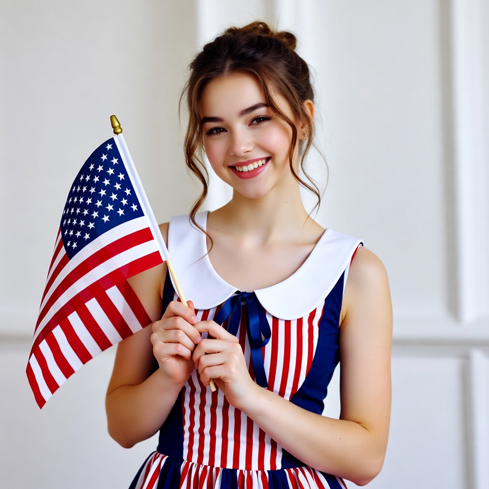 A young girl with brown hair in an updo smiles brightly while holding a small American flag in her hands. She wears a patriotic red, white, and blue striped dress with a white collar and bow. She stands against a plain white background.