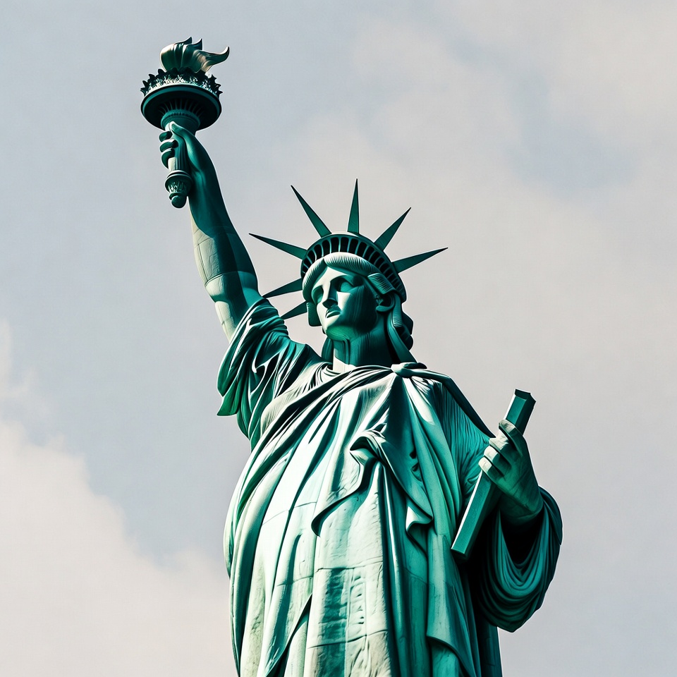 The Statue of Liberty stands tall with a glowing torch raised in her right hand and a tablet in her left. She wears flowing robes and a spiked crown, set against a cloudy sky. The iconic green copper statue symbolizes freedom.