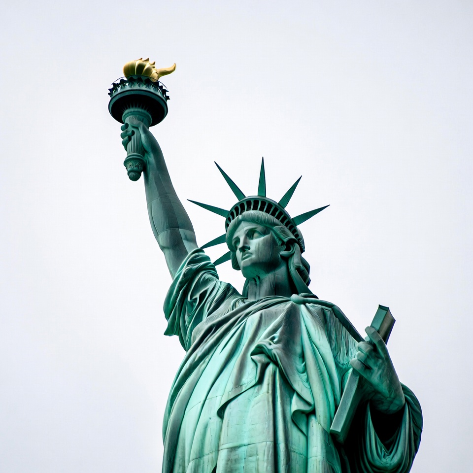 American symbol, New York, crown, golden torch, green patina, isolated background, landmark, liberty statue, monument, sculpture, spikes, statue, tablet, torch, Statue of Liberty