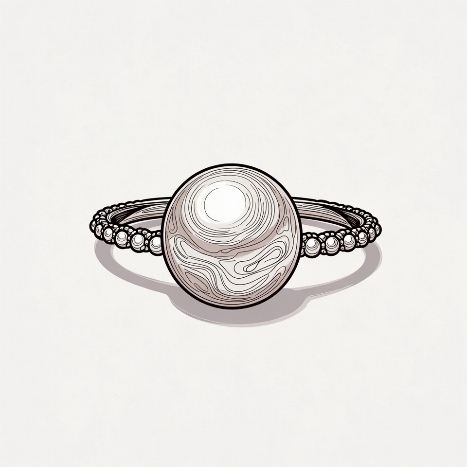 A detailed line drawing of a elegant ring features a large central pearl with subtle wave patterns. The pearl is encircled by a thin band adorned with small beads. The illustration is presented on an isolated white background with a soft shadow.