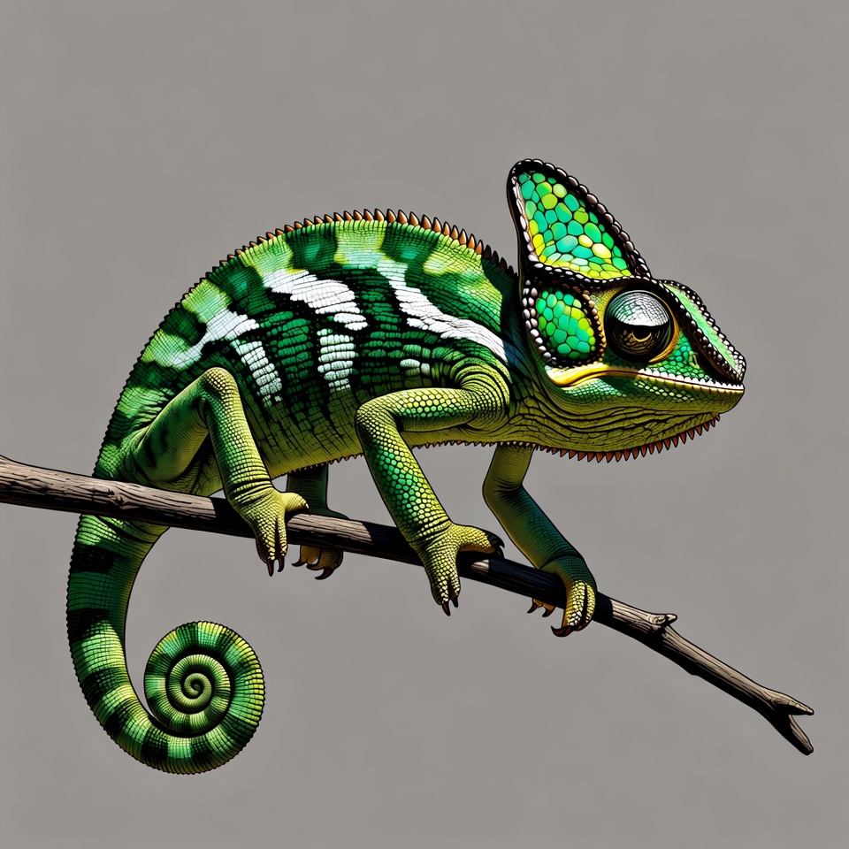A vibrant green chameleon with white stripes clings to a thin branch. It features a prominent casque on its head and large bulging eyes. The creature's curled tail hangs below, set against a smooth gray background.