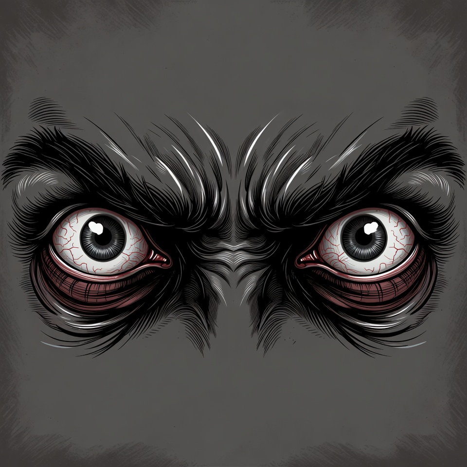 aggressive look, artistic rendering, black eyebrows, bold lines, close-up, dark background, digital art, dramatic eyes, evil eyes, eyebrows, fantasy eyes, fierce gaze, furry brows, glowing eyes, horror eyes, illustration, intense eyes, menacing stare, monster eyes, red eyes, scary illustration, shaded eyes, vector art, white pupils, angry eyes