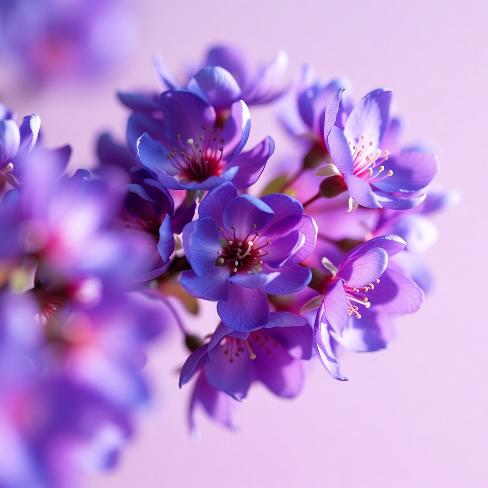 blooms, bokeh, close-up, cluster, delicate, floral, flower cluster, flowers, glossy petals, isolated background, nature, petals, pink background, purple, red centers, stems, vibrant, purple flowers