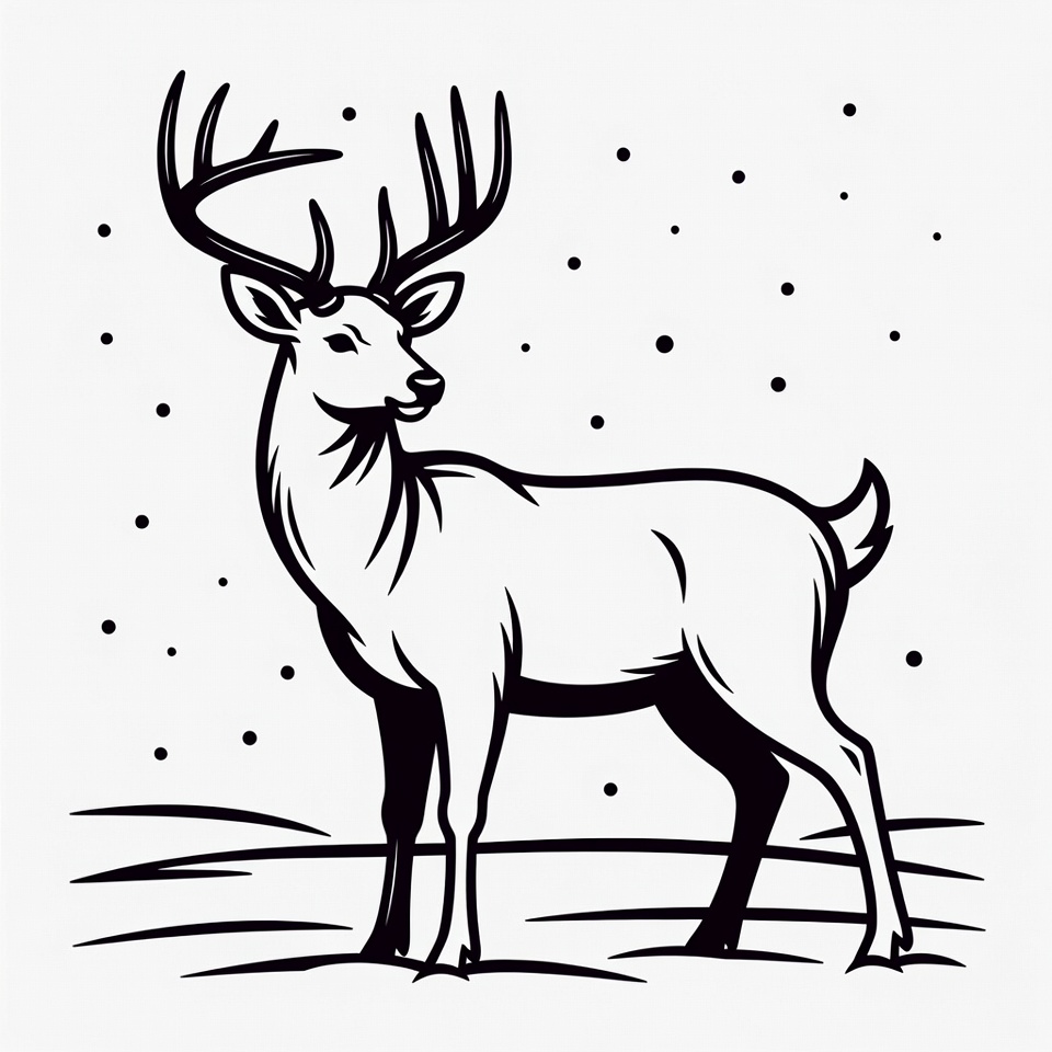 A black and white line art illustration of a majestic deer standing on a snowy landscape. The deer features large branching antlers and a detailed face, with snowflakes scattered around. It is depicted in a side profile on an isolated white background.