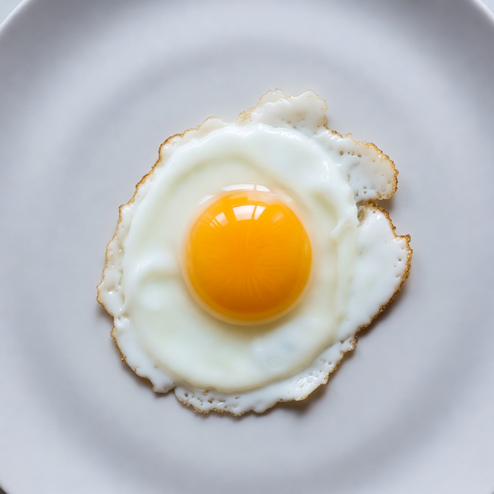 A single fried egg with a bright yellow yolk sits centered on a plain white plate. The egg white forms a lacy edge around the intact yolk. The composition is simple with a clean white background.