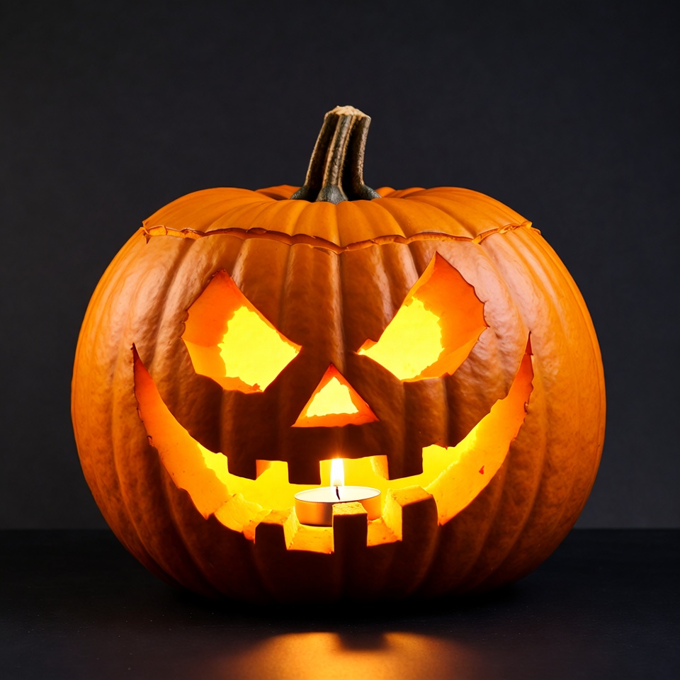 A carved orange pumpkin with glowing yellow eyes, nose, and jagged smiling mouth sits on a dark surface. A small candle burns inside, illuminating the jack-o'-lantern face from within. The background is solid black, highlighting the pumpkin's eerie glow.
