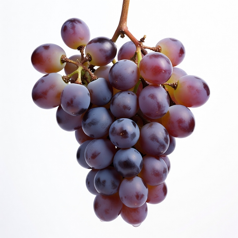A fresh cluster of purple grapes hangs from a thin stem against a white background. The grapes are plump and glossy, with some showing a reddish hue. The bunch is tightly packed and isolated for a clean view.
