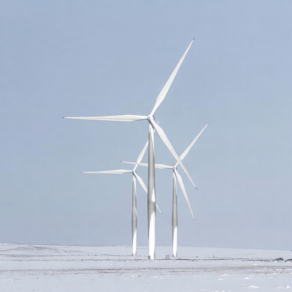 blue sky, clean energy, cold weather, electricity, environment, isolated background, landscape, outdoors, power generation, renewable energy, snow, snowy field, sustainable, three turbines, white blades, wind farm, winter, wind turbines