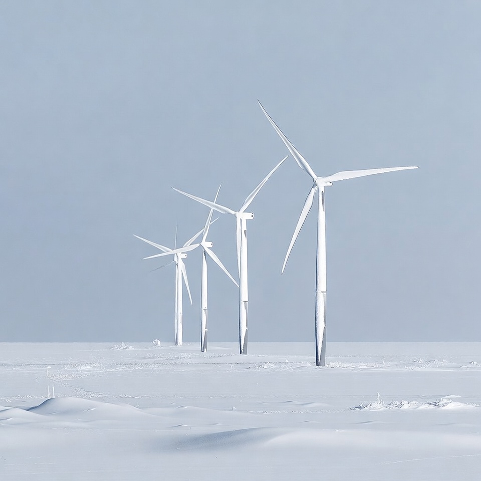 Four white wind turbines stand in a row on a vast snowy plain under a pale blue sky. Their blades are angled and covered in frost. The scene features a flat, icy expanse with subtle snow drifts.
