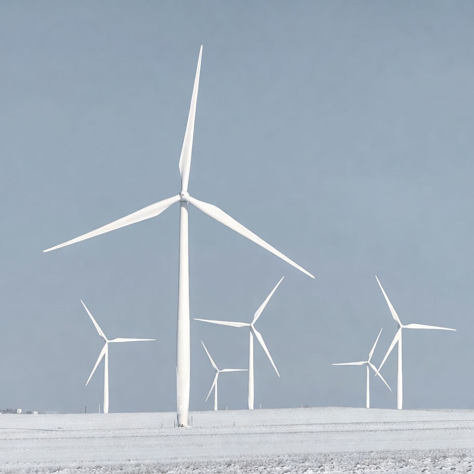 Several white wind turbines stand tall in a snowy field under a pale blue sky. The blades are positioned at various angles, with a prominent central turbine. The ground is covered in fresh snow, emphasizing the clean, renewable energy structures.