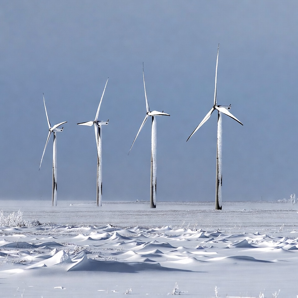 arctic windmills, blades, blue sky, cold landscape, energy production, frosty, frozen turbines, ice-covered, isolated background, renewable energy, snow, snowy dunes, snowy field, towers, turbines in snow, white snow, wind farm, wind power, winter, wind turbines