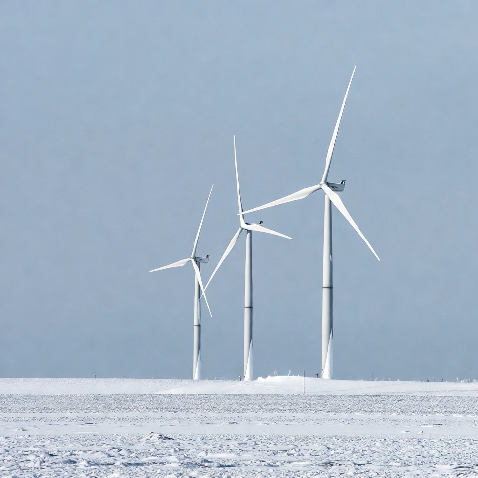 arctic scenery, blue sky, clean energy, frozen ground, power generation, renewable energy, snow covered, snowy field, three turbines, turbine blades, white turbines, wind farm, wind power, winter landscape, wind turbines
