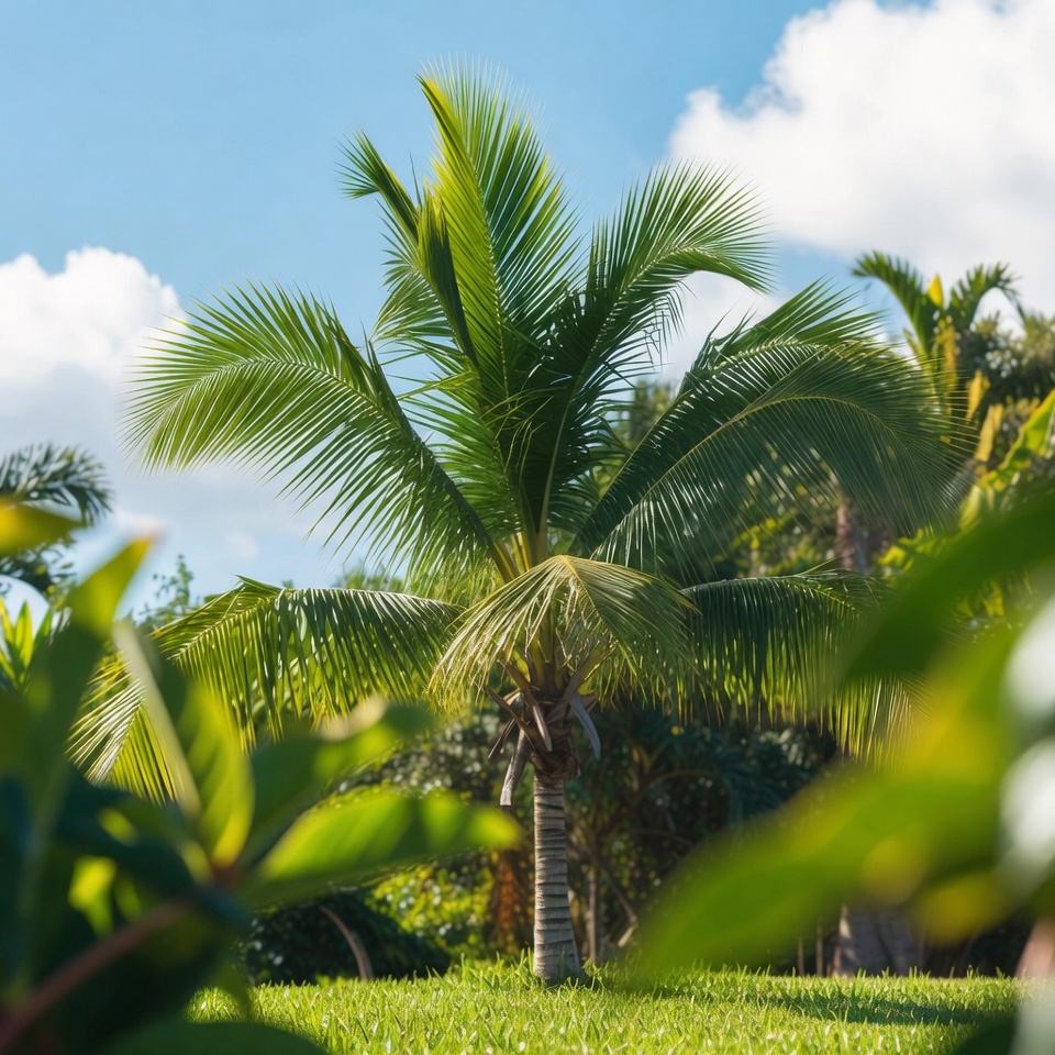 A tall palm tree with lush green fronds stands prominently in a tropical garden under a bright blue sky with scattered white clouds. The tree is framed by foreground green leaves and surrounded by other palm trees and grass. Sunlight highlights the vibrant greenery and trunk.
