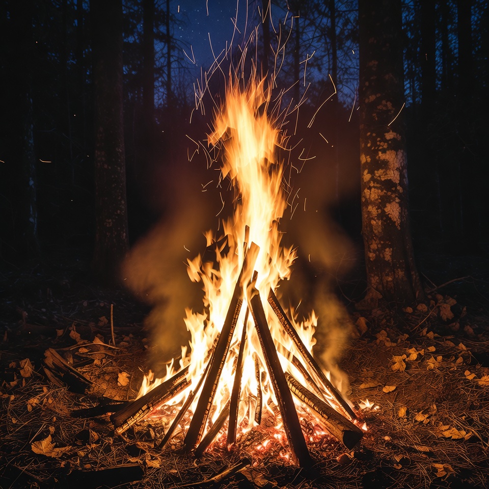 A tall campfire with bright orange and yellow flames burns intensely at night, surrounded by tall pine trees. Sparks rise into the dark starry sky above the fire. Fallen leaves and branches cover the forest floor around the teepee-shaped wood pile.