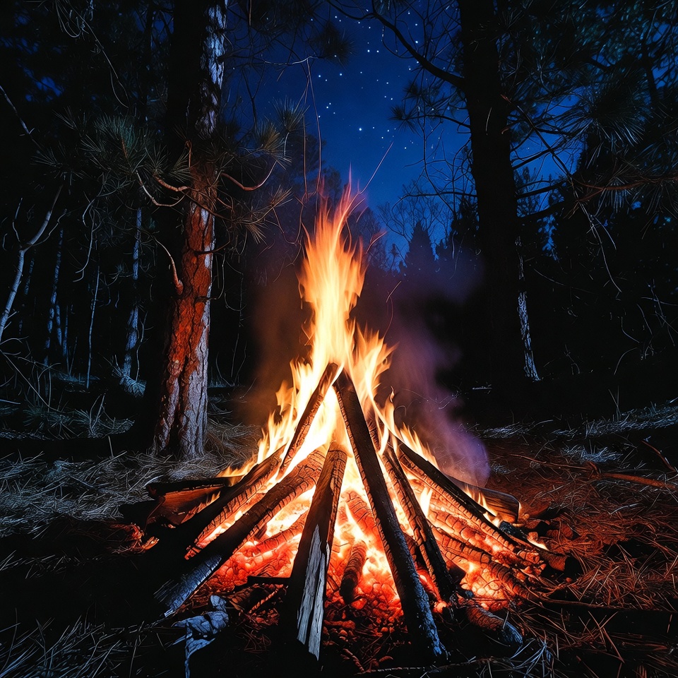 A vibrant campfire with tall orange and yellow flames burns brightly in a dark forest at night. Surrounding pine trees with reddish trunks frame the fire, and stars twinkle in the deep blue starry sky above. Smoke rises from the stacked logs on the forest floor littered with pine needles.