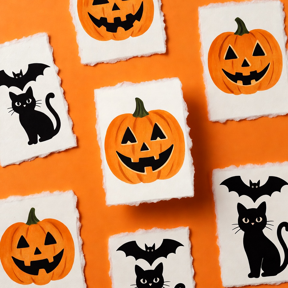 Halloween decoration, bat, bat silhouette, black cat, carved face, carved pumpkin, cat silhouette, clipart, collage, decals, flying bat, illustration, jack-o-lantern, orange background, pumpkin, pumpkin face, spooky, stickers, textured paper, white paper, Halloween