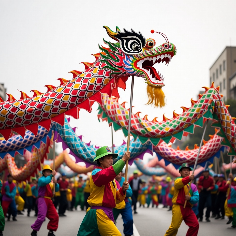 Asian, Chinese dragon, buildings, celebration, colorful costumes, conical hats, cultural, dancing, dragon head, dynamic, festival, green dragon, group, holding poles, men, parade, performance, performers, red dragon, street, traditional, twisting dragon, urban street, vibrant, yellow dragon, dragon dance