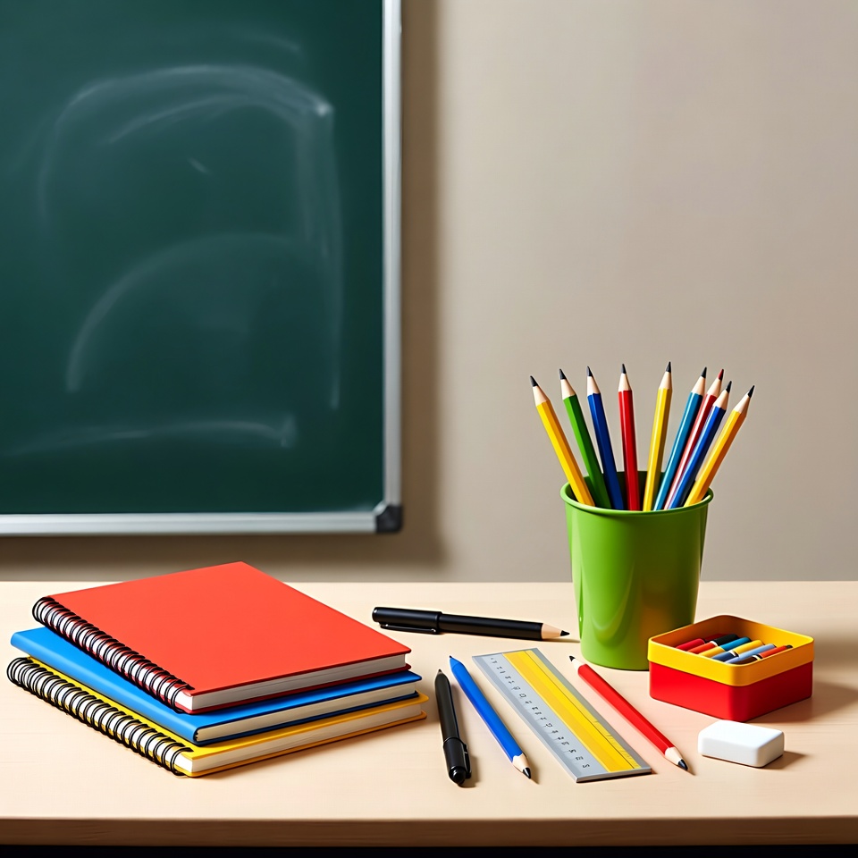 A wooden desk in front of a green chalkboard holds a stack of colorful notebooks in blue, yellow, and red. A green cup contains assorted colored pencils, flanked by black pens, rulers, a small box of crayons, and an eraser. The setup features typical classroom stationery on an isolated background.