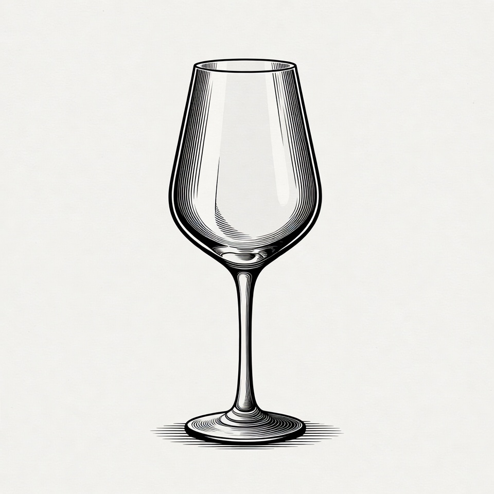 A detailed line art illustration of an empty wine glass with a tall stem and wide bowl. The glass features intricate shading lines and stands on a plain isolated background. It is rendered in a classic engraving style.