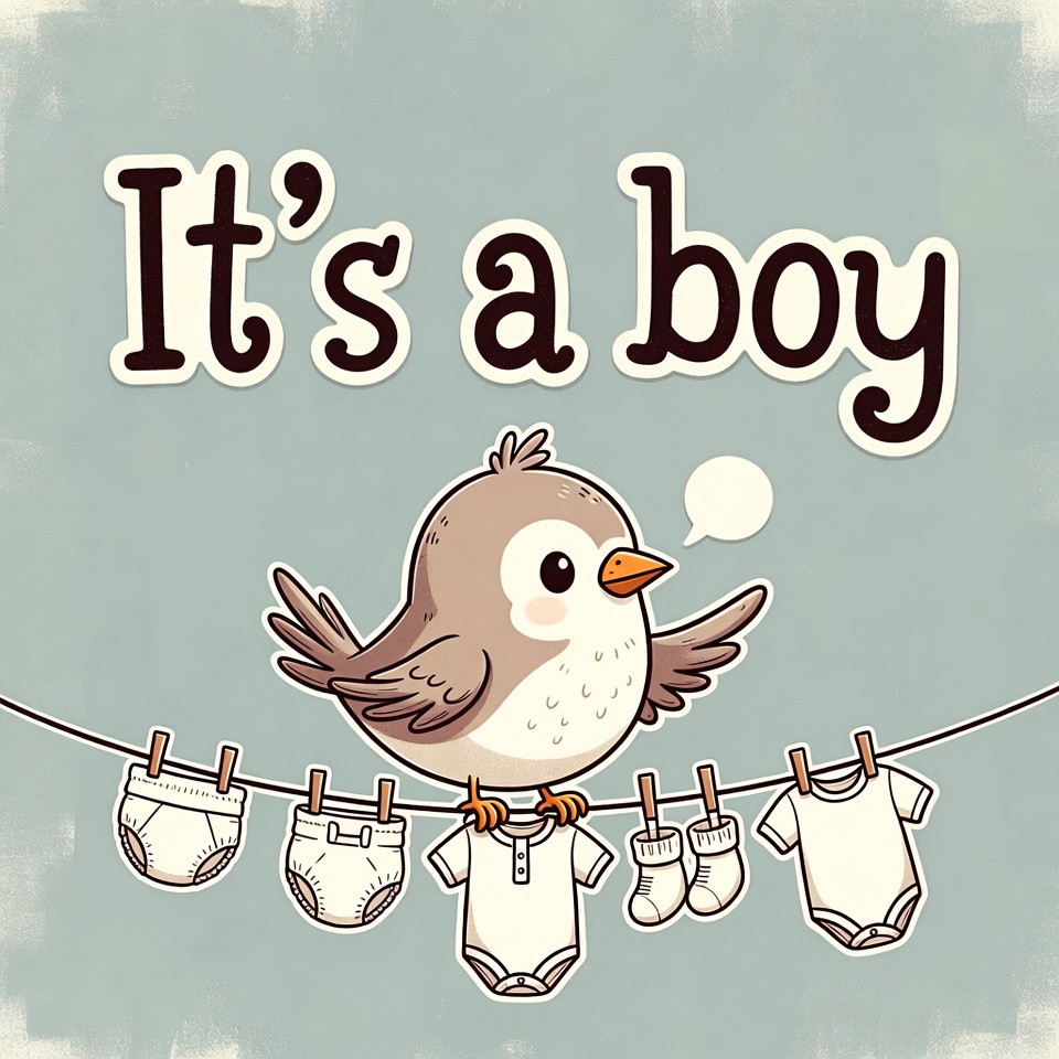 baby announcement, baby clothes, beige background, bird clipart, booties, cartoon bird, clothesline, cute bird, diapers, gender reveal, illustration, isolated background, newborn, onesies, sparrow, vintage style, it's a boy