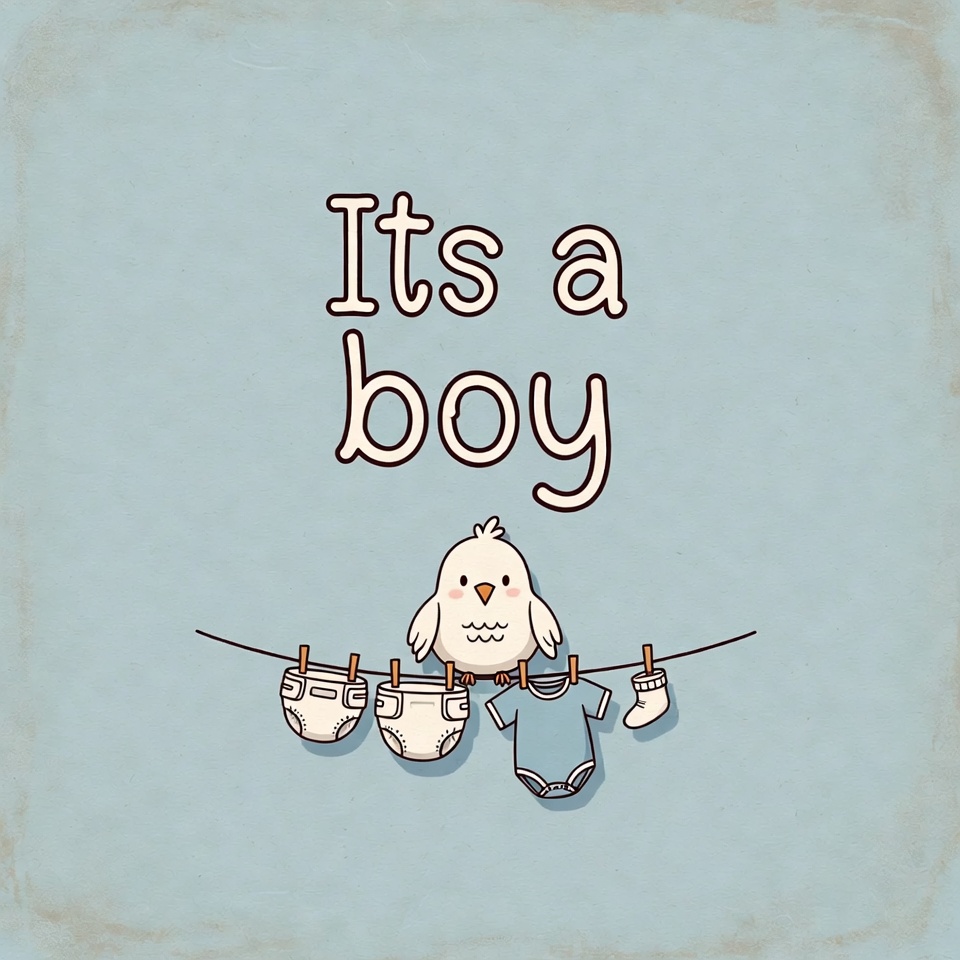 A cute cartoon bird hangs from a clothesline with white diapers and blue baby onesies on a light blue background. Bold text 'It's a boy' appears above the illustration. The image has a vintage, faded style with soft edges.